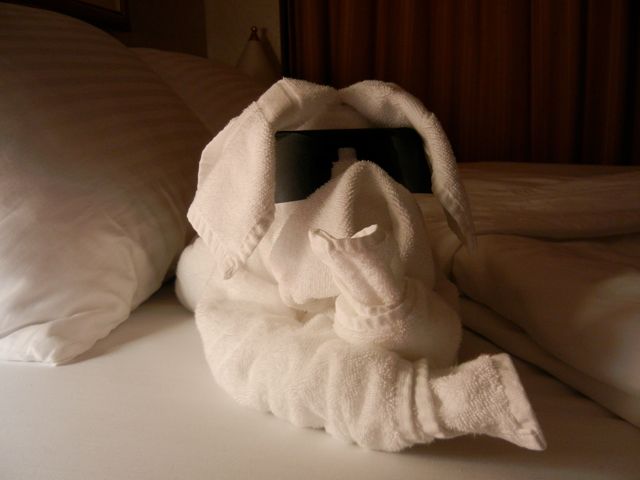 Towel Art (Puppy in sun glasses?) Cabin 7220, Carnival Splendor