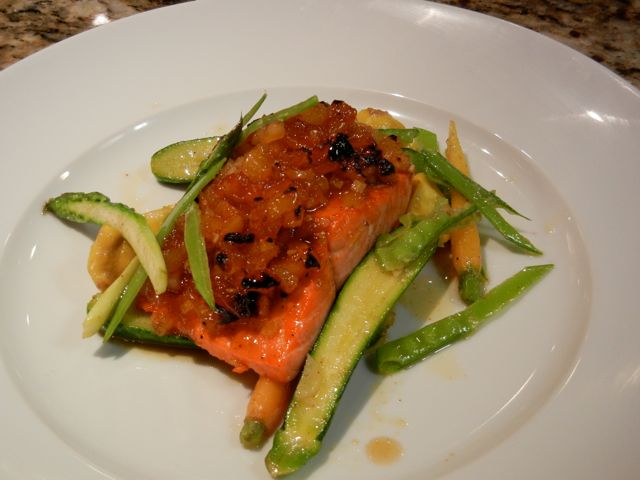 Apricot glazed salmon with baby veggies, cooking demo on MS Statendam