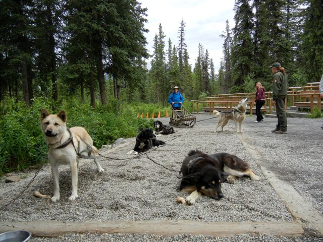 Sled dogs resting after a demo run over gravel. Denali N.P.