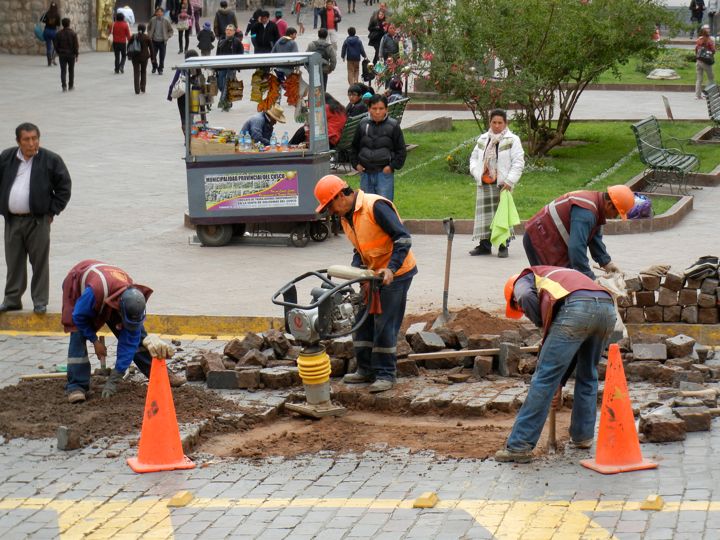 Sidewalk superintendents observing street repair crew, Cusco, Peru