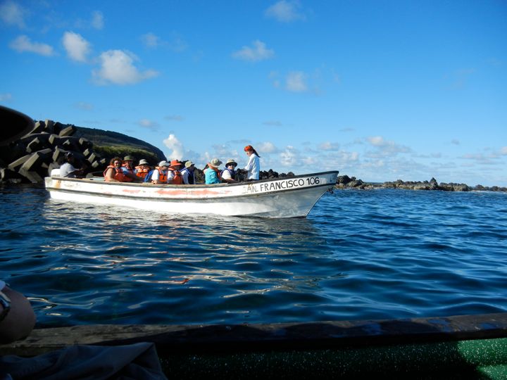 Boat "San Francisco" with German guide touring Motu Nui (bird island), Easter Island