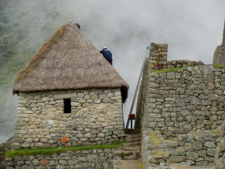 Thatching a steep roof, Machu Picchu, Peru