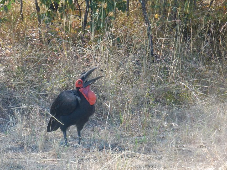 Southern ground-hornbill (Bucorvus leadbeateri) eating, Zambezi N.P., Zimbabwe