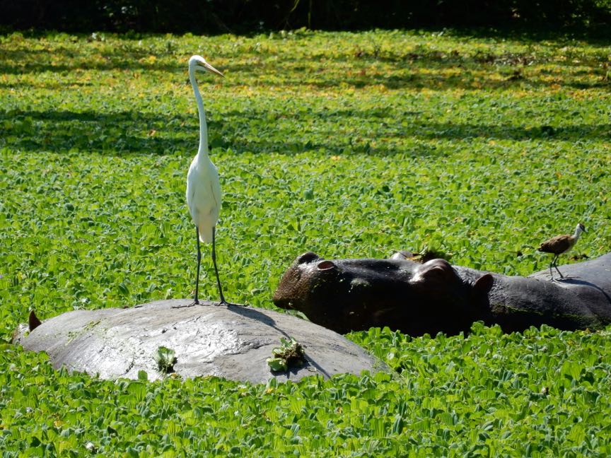 Egret and jacara riding hippos eating Nile cabbage, Mfuwe Lodge, South Luangwa N.P., Zambia