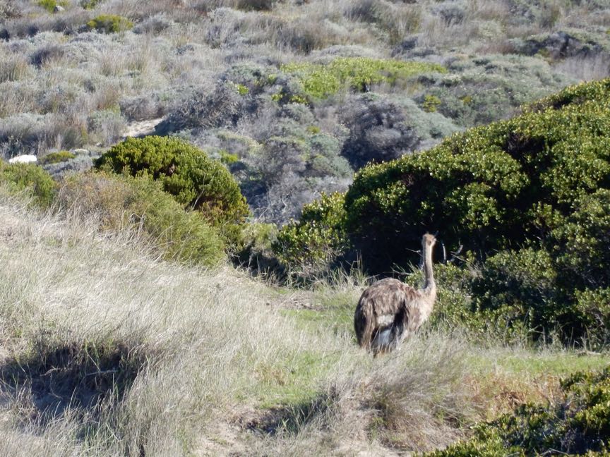 A Common ostrich (Struthio camelus), foraging in the fynbos (vegetation), Cape of Good Hope, South Africa