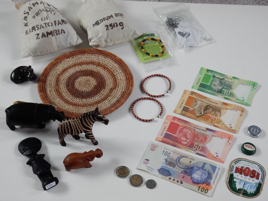 Souvenirs: Zambian coffee, copper bracelets, wood and stone carvings, jewelry, palm-leaf mat, money, beer caps