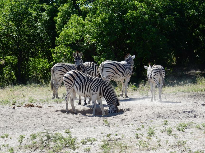 A dazzle (herd) of plains zebras, {Equus quagga) digging up mineral-rich soil, Botswana