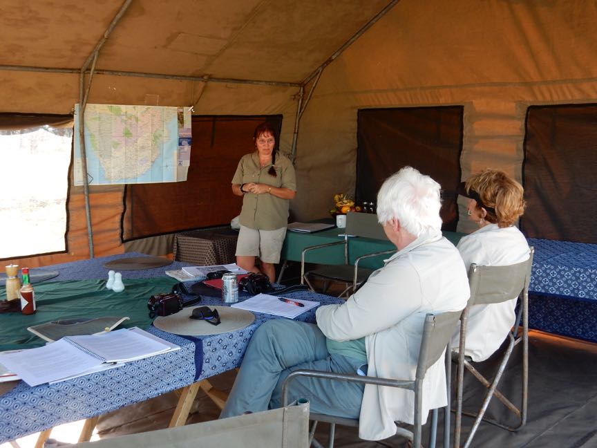 Afternoon lecture by Lisa Reed about Botswana in mobile tent camp, Botswana
