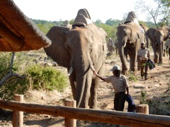Bringing in the elephants at "Elephant Experience", Victoria Falls, Zimbabwe