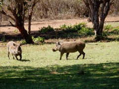 Common warthogs (Phacochoerus africanus) on the lawn, Imbabala Lodge, Zambezi N.P., Zimbabwe