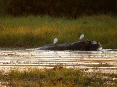 Hippo with three Little Egret riders (Egretta garzetta), Zambezi River, Zambezi N.P., Zimbabwe