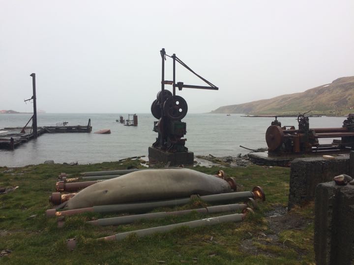 Southern Elephant Seal (Mirounga leonina) sleeping on old whaling equipment at Grytviken, South Georgia