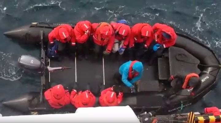View from above of Zodiacs loading at Fast Ice near Snow Hill Island
