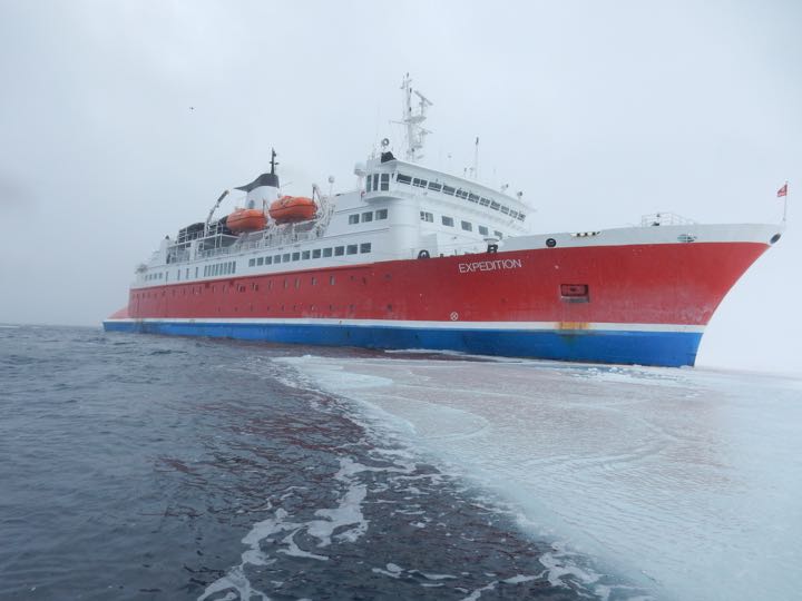 Progress of ship MS Expedition stopped by fast ice near Snow Hill Island