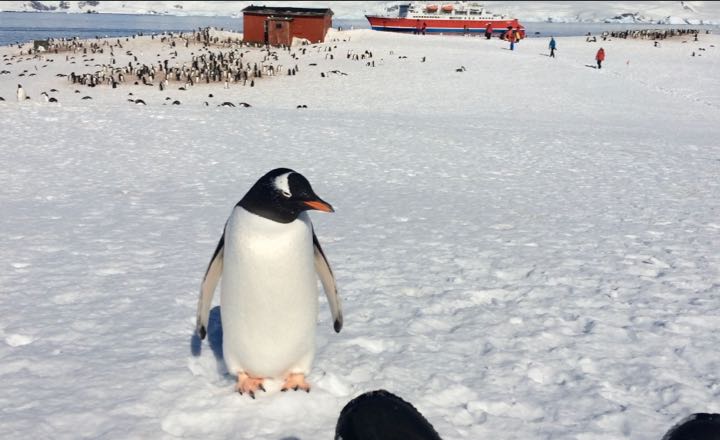 A curious gentoo penguin (Pygoscelis papua) on D'Hainaut Island in Mikkelsen Harbor, on Trinity Island See video
