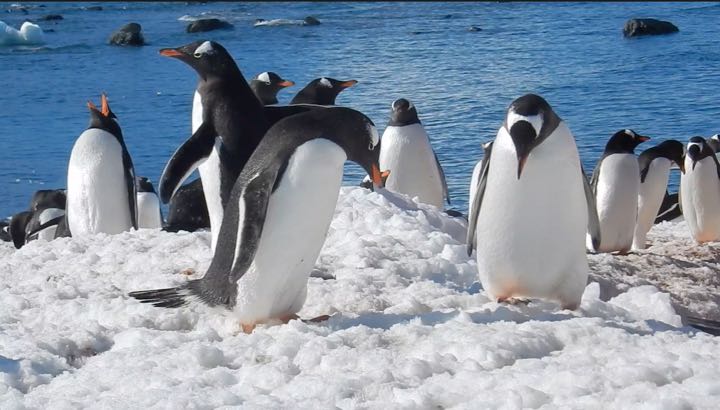 Gentoo penguin colony (Pygoscelis papua) courting on D'Hainaut Island in Mikkelsen Harbor, on Trinity Island See video