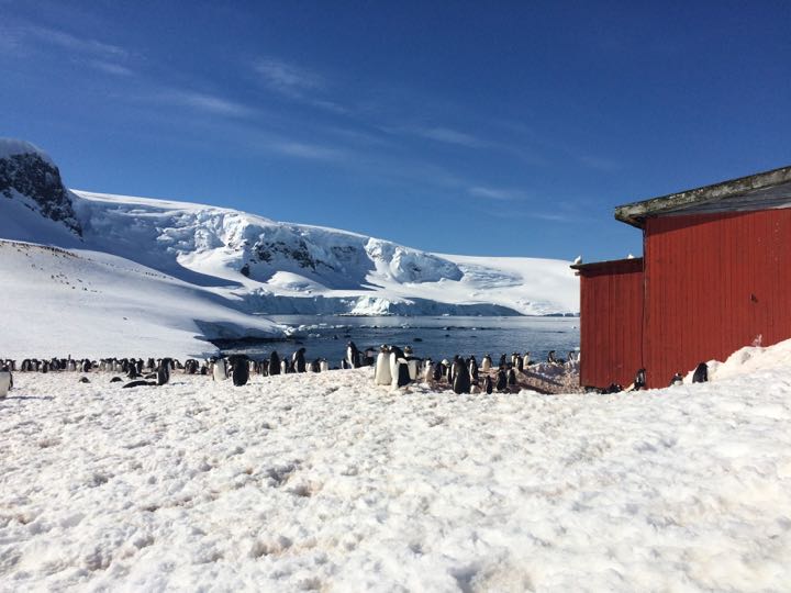 Gentoo penguins (Pygoscelis papua) occupying a decrepit Argentine refuge hut on D'Hainaut Island in Mikkelsen Harbor, on Trinity Island