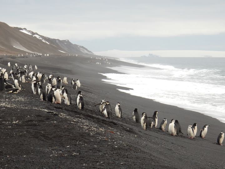 Chinstrap Penguins (Pygoscelis antarctica) on beach at Baily's Head, Deception Island