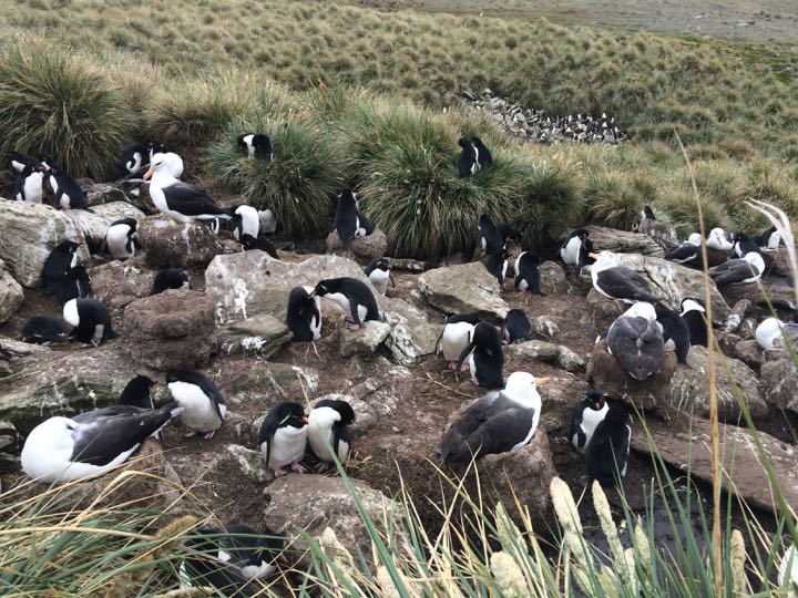 Rockhopper Penguins (Eudyptes crestatus) and nesting black-browed albatrosses (Thalassarche melanophris), West Point Island, Falklands See video