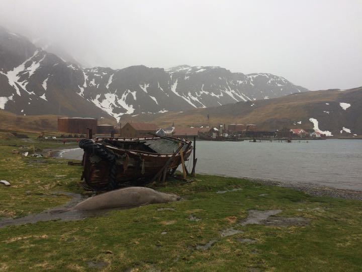 Old whale boat and Southern Elephant Seal (Mirounga leonina) at Grytviken, South Georgia