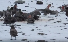 Giant petrels fighting over a King penguin, Right Whale Bay, South Georgia Island |