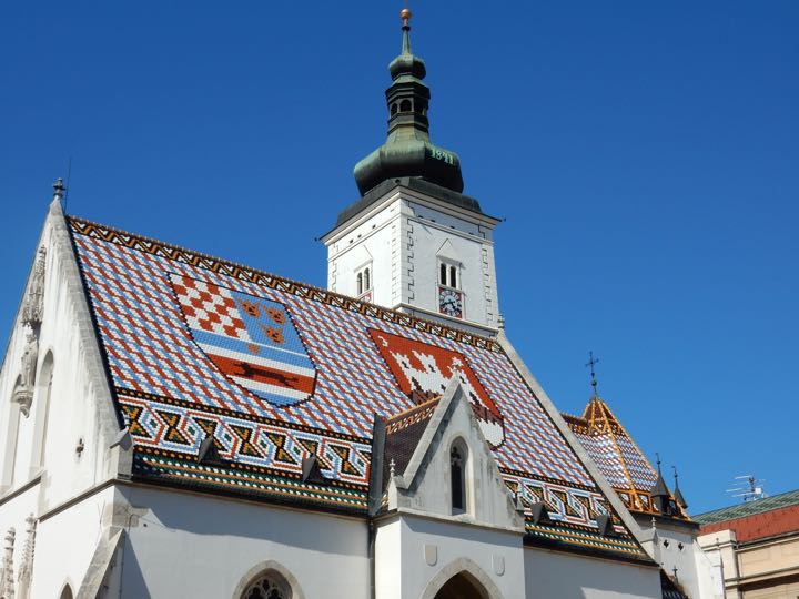 Tile roof on Church of St. Mark showing coats of arms of Croatia (left) and Zagreb, Zagreb, Croatia