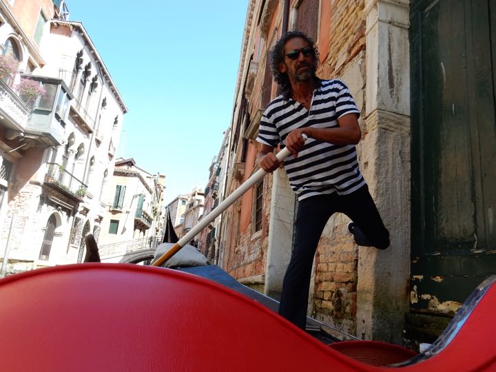 Our gondolier pushing off from a wall, Venice, Italy