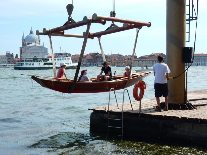 Lifting a row boat from Canale della Guidecca, Venice, Italy