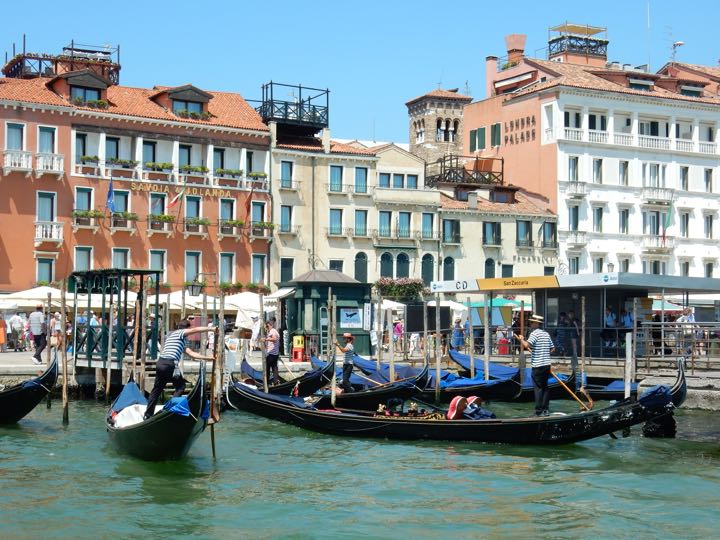 Gondoliers at San Zaccaria watertaxi station near San Marco Square, Venice, Italy
