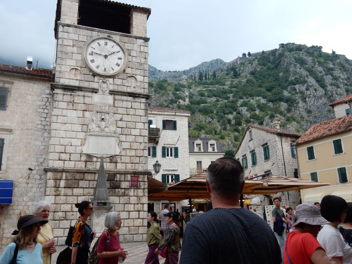 Old town and clock tower with chapel and fortress above, Old Town, Kotor, Montenegro