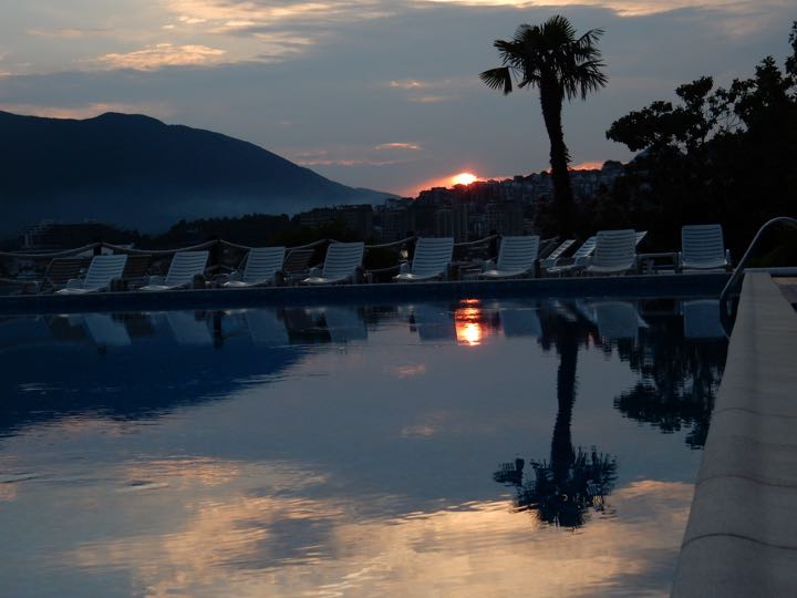 Sunset over pool at hotel in Herceg Novi, Montenegro