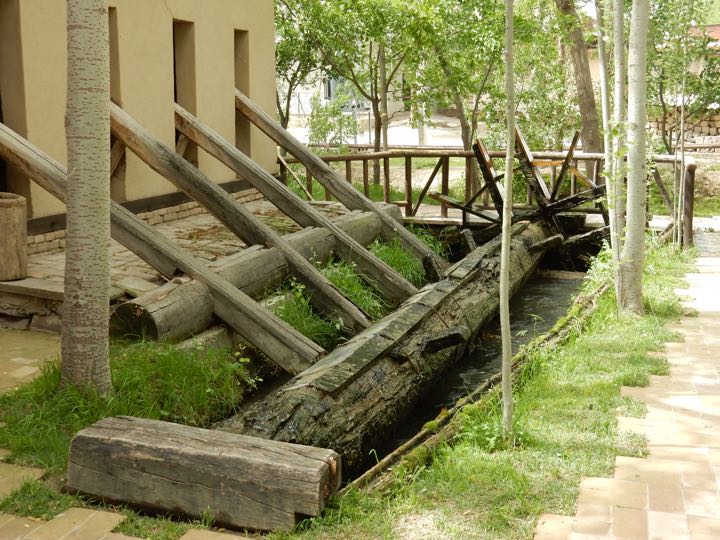 Waterwheel-powered stamping press at mulberry paper factory, Samarkand, uzbekistan