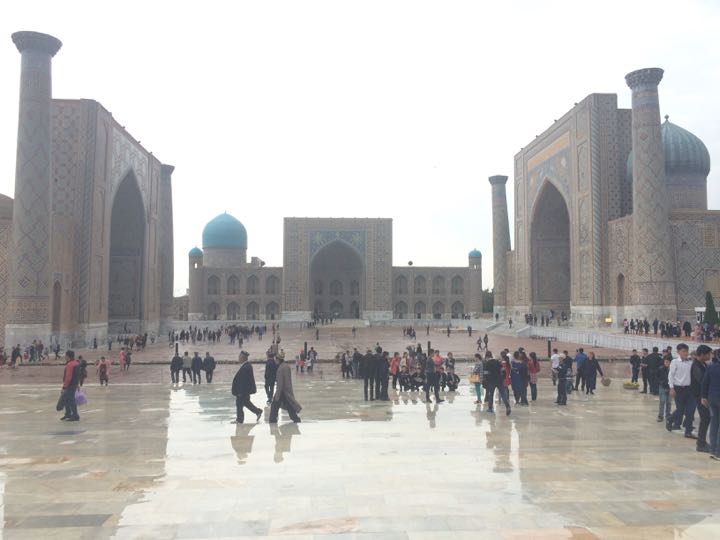 Reflections on a rainy day at Registan Square: Ulugbek Madrassa on the left (1420); Tilla-Kari Madrassa (1660) in the middle; Sher Dor Madrassa on the right (1636): Samarkand, Uzbekistan