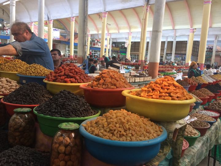 Vendor of dried apricots, raisins and nuts in Panchshanbe Bazaar, Khujand, Tajikistan