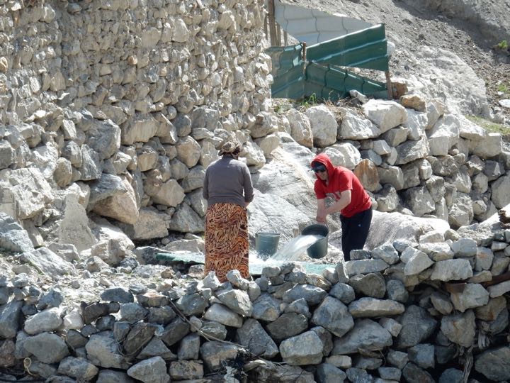 Couple washing carpets along Varzob River north of Dushanbe, Tajikistan