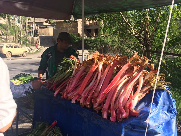 Vendor selling rhubarb stalks north of Dushanbe, Tajikistan