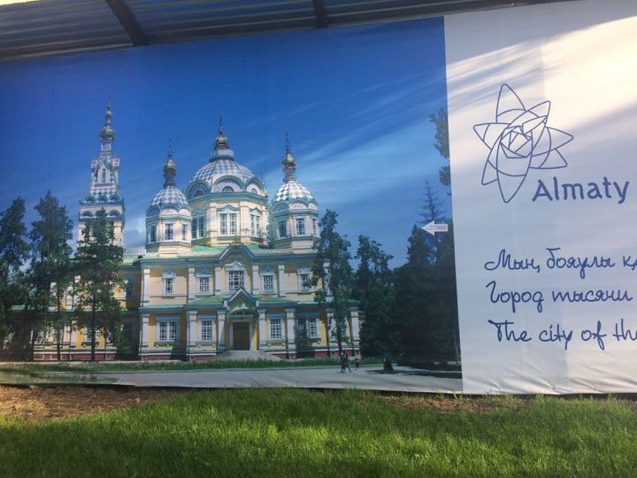 A sign showing how Zenkov Cathedral will look after renovation, Almaty, Kazakhstan