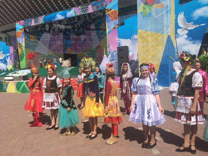 Costumed children ready to compete in dance competition, Almaty, Kazakhstan