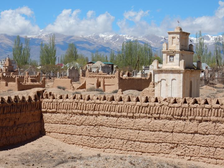Cemetery monuments and the Ala-Too Mountains near Cholpon-Ata, Kyrgyz Republic
