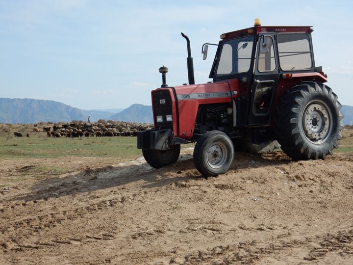Massey-Fergeson tractor and sheep at horse stable outside Ashkabat, Turkmenistan