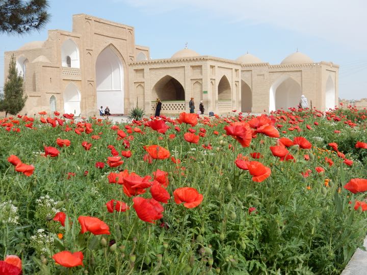 Red poppies at Hodja Yusup Baba mosque and mausoleum, Merv, Turkmenistan