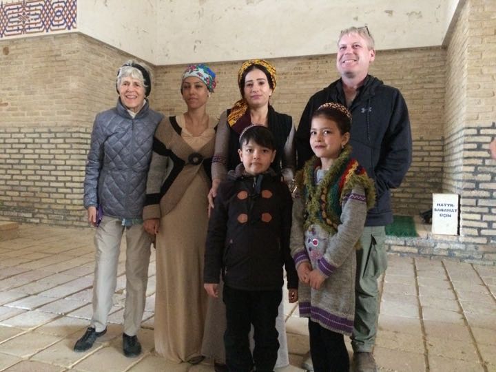 Our tour leader, Jonathan Hodgson with June Krantz and a local family inside Sultan Sanjar mausoleum, Merv, Turkmenistan