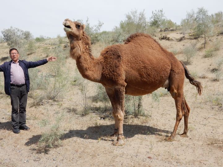 A dromedary camel walking through the Kara Kum desert north of Merv, Turkmenistan