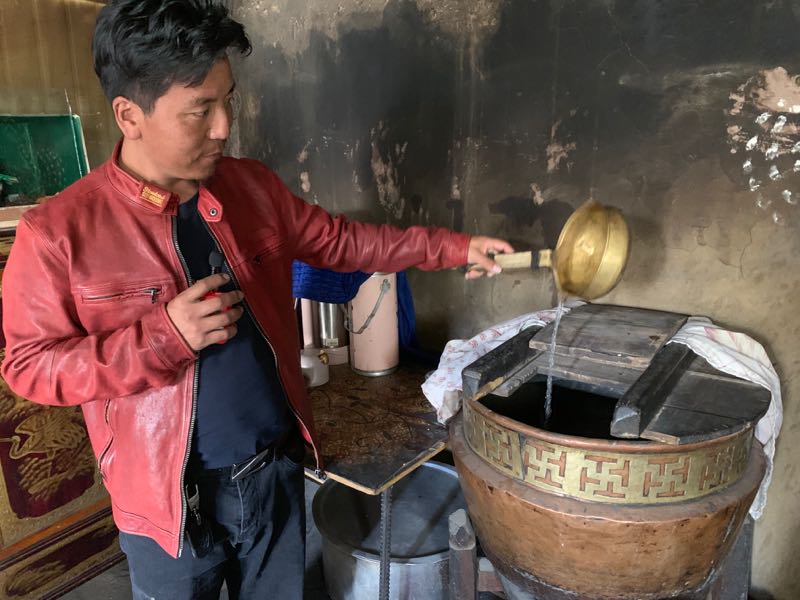 Water heated over yak-dung fire at home visit, west of Lhasa
