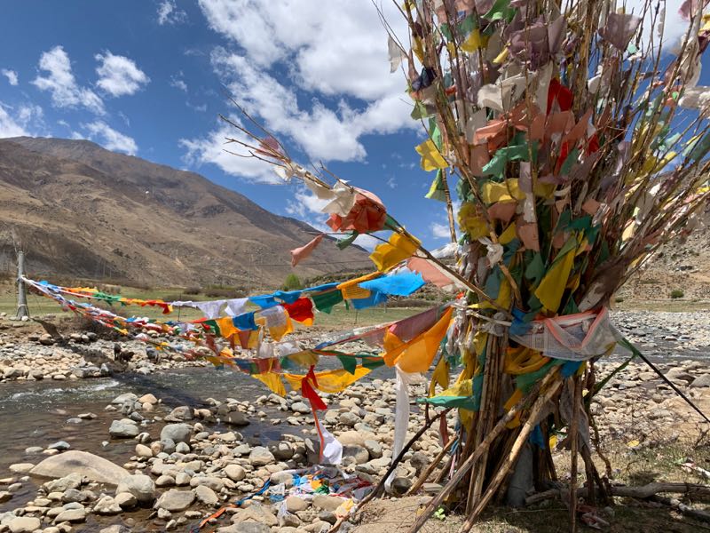 Prayer flags at stream by outdoor lunch, west of Lhasa