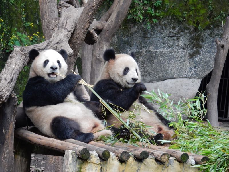 Twin giant pandas (Ailuropoda melanoleuca) in zoo chomping bamboo, Chongqing