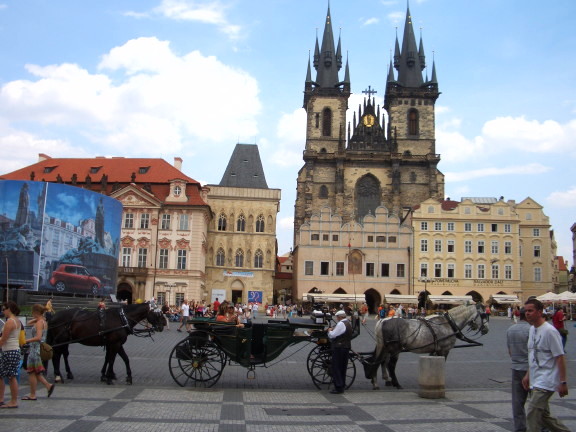 Church of Our Lady before Tyn and horse carriages in Old Town Square - Prague