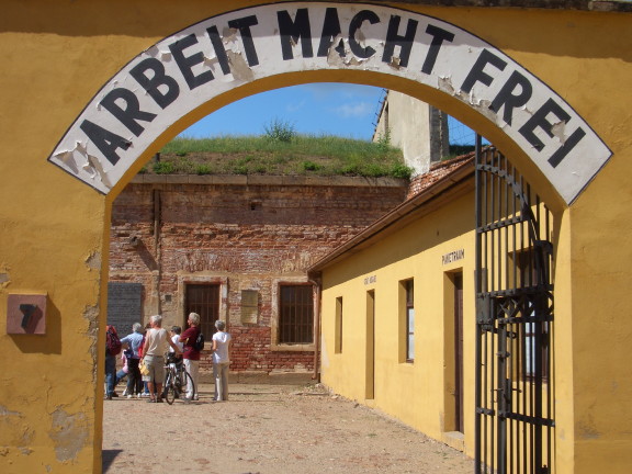 "Arbeit macht frei" ("Work brings freedom") sign at entrance to Terezin concentration camp