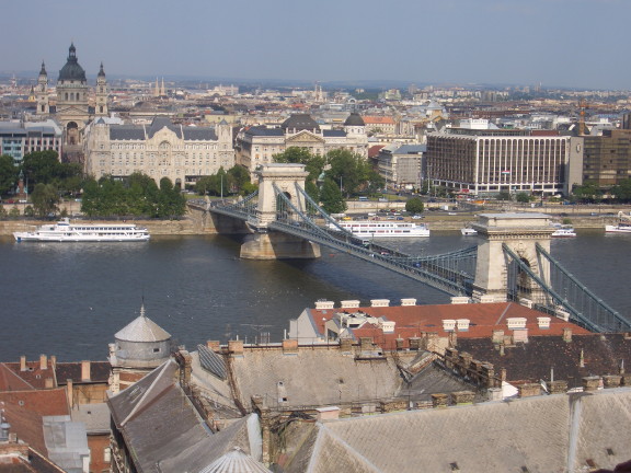 View from Castle Hill (Buda side of the river) overlooking th Chain Bridge and the Pest side of the city