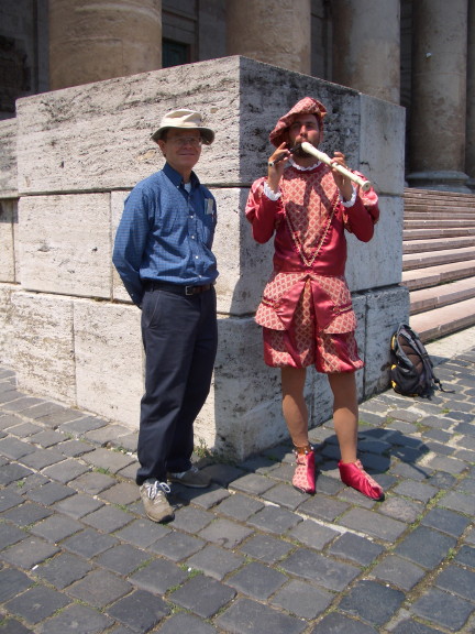A renaissance musician (playing two recorders) outside Esztergom basilica